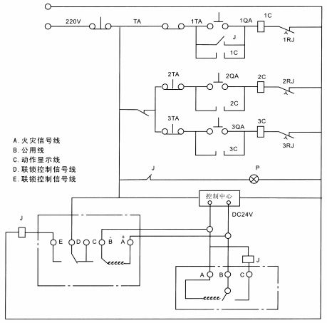 3、 如要選雙微動(dòng)開關(guān)時(shí),無論是手動(dòng)控制還是控制中心發(fā)出DC24V電訊號控制都能使排煙風(fēng)機(jī)(或加壓送風(fēng)機(jī))、排風(fēng)機(jī)、空調(diào)風(fēng)機(jī)聯(lián)動(dòng)。此時(shí)繼電器J的控制電壓為AC220V,若選單微動(dòng)開關(guān)時(shí),控制中心發(fā)出DC24V電訊號,可以聯(lián)動(dòng)排煙風(fēng)機(jī)(或加壓送風(fēng)機(jī)),如手動(dòng)使防火排煙閥動(dòng)作要等到控制中心得到火警發(fā)出DC24V電訊號后才能聯(lián)動(dòng)其它設(shè)備,否則要人為按動(dòng)2QA、3QA、2TA按鈕。